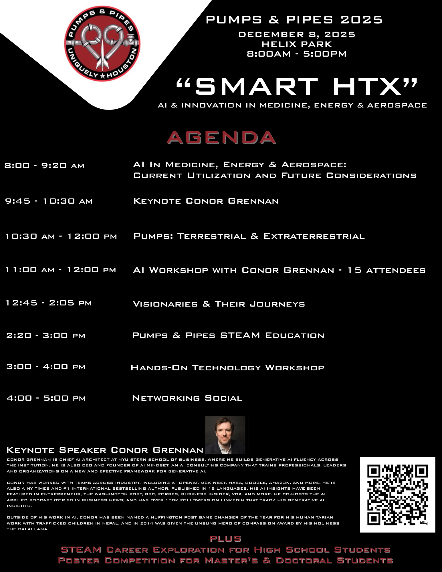 Join us December 8, 2025 for our annual event, Smart HTX. This year we are excited to welcome Conor Grennan as the keynote address. The focus of this year’s event is AI and innovation in Medicine, Energy and Aerospace.